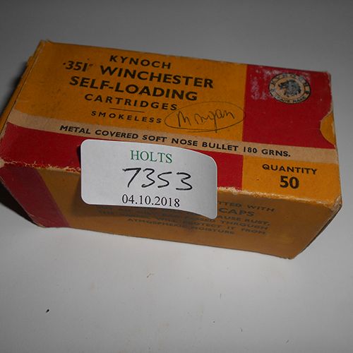 THIRTY EIGHT .351 WINCHESTER SELF LOADING CARTRIDGES, comprising of one kynoch retail carton with 180grn metal covered solid bullet cartridges.