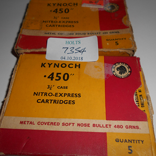 TEN .450 X 3 1/4IN. KYNOCH NITRO EXPRESS CARTRIDGES, comprising of two kynoch retail cartons with five rounds of 480 gr solid in one carton and five rounds of 480 grain metal covered soft nose