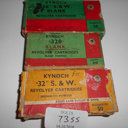 FIFTY .32 S&W REVOLVER CARTRIDGES PLUS .320 BLANK AND .38 BLANK, comprising of one carton of kynoch 85 grn solid lead bullet cartridges, with 8 rounds of .38 s&w blank by kynoch and 27 rounds of .32 blank by kynoch.