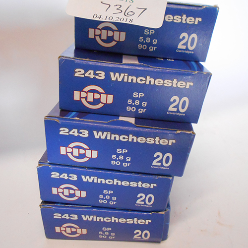 ONE HUNDRED .243 WIN CARTRIDGES BY PRIVI PARTISAN, comprising of five retail cartons of 20 rounds, 90grn sp.