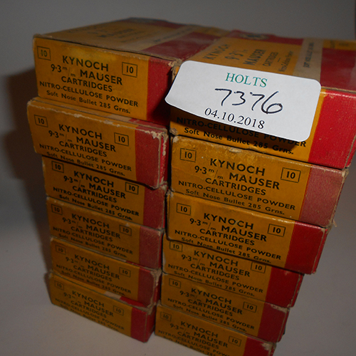 ONE HUNDRED AND TWENTY 9.3 MM MAUSER CARTRIDGES BY KYNOCH, comprising of 12 original cartons of ten rounds 285 grain soft nose