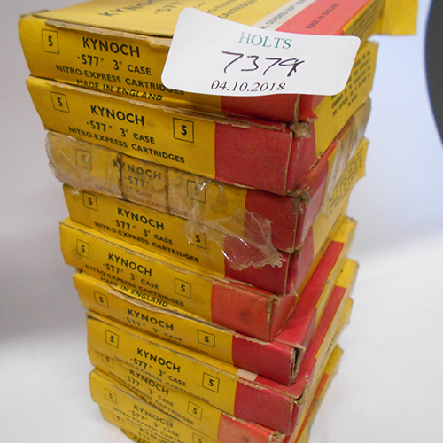 FORTY SEVEN .577 X 3 IN NITRO EXPRESS COLLECTABLE CARTRIDGES BY KYNOCH, comprising of 9 original cartons of five rounds 750grain soft nose