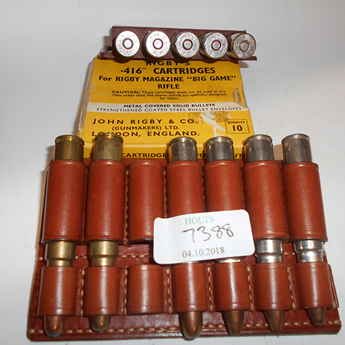 TWENTY ONE .416 RIGBY CARTRIDGES AND A LEATHER CARTRIDGE HOLDER TO GO ON A BELT BY SCHILBER, comprising of ten rounds john rigby's big game metal covered and coated bullets of unknown weight, eight rounds of federal sn, two rounds of hornady one sn and one fmj and one round of norma sn.