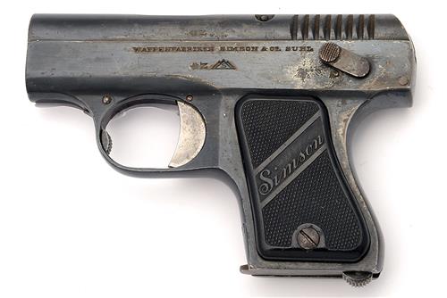 A .25 (ACP) SEMI-AUTOMATIC POCKET-PISTOL SIGNED SIMSON, MODEL 'M1927', serial no. 30687, with 2in. barrel, blued slide with top ejection port, blued frame and chequered black plastic grips