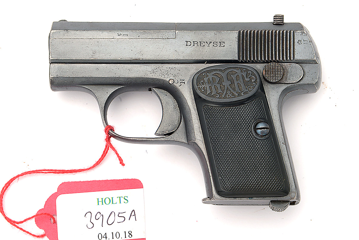 A .25 (ACP) SEMI-AUTOMATIC POCKET-PISTOL SIGNED DREYSE, MODEL '1907 PATENT', serial no. 65913, with concealed 2in. barrel, angled slide with matching barrel-cover and one-piece sighting-rib, blued frame and chequered hard-rubber grips