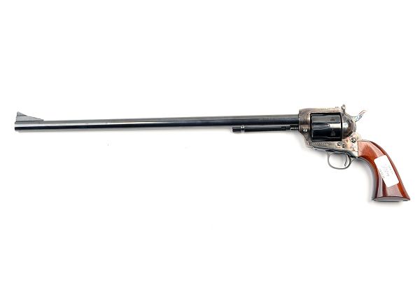A BOXED .44 (MAG) LONG-BARRELLED REVOLVER SIGNED UBERTI, MODEL 'BUNTLINE SPECIAL', serial no. 155859, built for the UK market with blued 18in. barrel, blued fluted cylinder, colour hardened frame with single action mechanism and smooth walnut grips