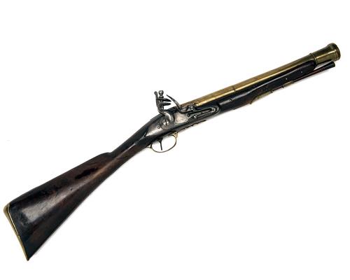 for Sligo, Ireland circa 1765, with round two-stage 14 1/4in. barrel, flared banded cannon muzzle, moulded band at breech, the top of barrel signed 'DUBLIN' together with the registration number, the breech stamped with London proofs and maker's mark 'RT', borderline engraved lock signed 'RICHARDS', pointed tail, walnut three-quarter handrail stock (cracked through and repaired at wrist in antiquity), brass furniture including heel-plate (the spur also stamped with the registration number), trigger-guard tang and bow with acorn finial, octagonal cupped side-nails and turned ramrod throat and pipe, ramrod a later replacement