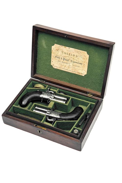 COLLINS, LONDON A CASED PAIR OF 80-BORE PERCUSSION TURN-OVER POCKET-PISTOLS, no visible serial numbers,