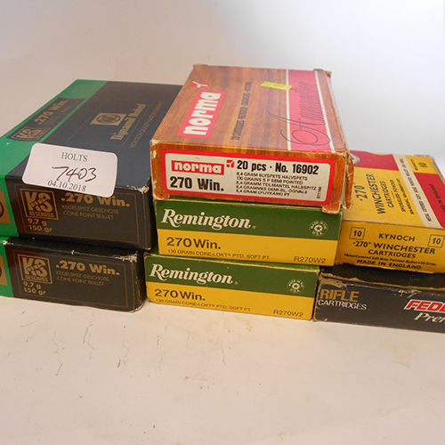 ONE HUNDRED AND TEN .270 WIN CARTRIDGES, comprising of 40 remington130 grn sp, 20 norma 130 grn sp, 10 kynoch 130 grn sn, 35 rws 150 grn conical ball, 4 federal 130 grn nosler partition and one winchester 130 gran sp.