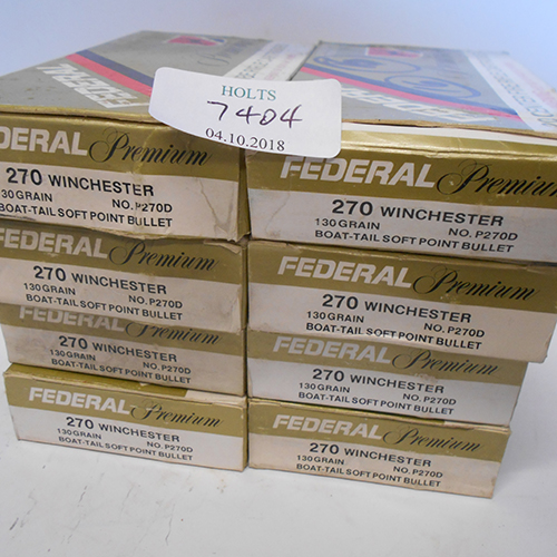 ONE HUNDRED AND FIFTY SIX .270 WIN CARTRIDGES, comprising of 7 retail cartons of 20 federal 130 grn boat tail soft point and one carton with just 16 in.