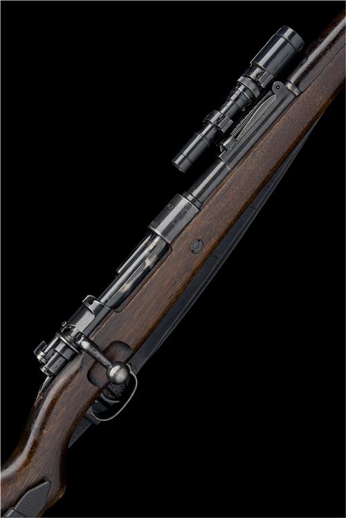 23 3/4in. nitro reproved barrel (in 2018) with ramp-mounted blade fore-sight, rear tangent sight graduated to 2000 metres, fitted with a ZF.41 telescopic sight (marked CXN for Emil Busch) over the rear sight in a side bracket, receiver ring marked 'S/42' and dated 1937, manual flag safety, matching numbers throughout, regulation semi-pistolgrip stock stamped B9487 to the left side, 13in. pull, leather sling