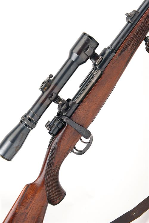 MAUSER 5.6X61 VOM HOFE BOLT-MAGAZINE SPORTING STUTZEN RIFLE, serial no. 85, 21 1/2in. nitro barrel, ramp-mounted bead fore-sight, block-mounted leaf rear-sight, the receiver mounted with a Dinox 4x81 telescopic sight, with quickly detachable mounts, manual bolt safety, detachable floorplate, set triggers, 14in. well-figured full-length pistolgrip stock with bone pommel and cheekpiece, leather sling, leather muzzle cover, together with approx. 80 brass 5.6 cases and a set of reloading dies