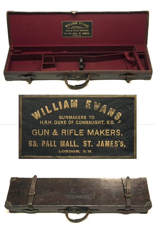 fitted for 28in. barrels, the interior lined with maroon baize, a leather gold-tooled William Evans trade label, brass lock (key missing), the lid exterior with the initials 'R.S. WILPSHIRE.'