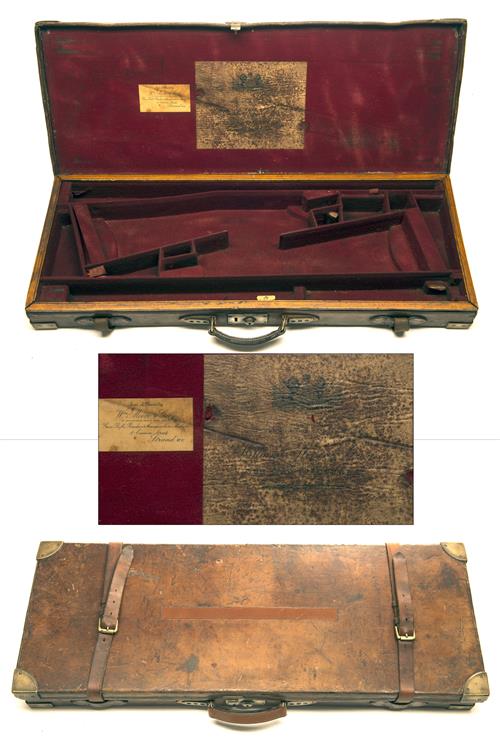 fitted for 30in. barrels, the interior lined with red baize, a paper William, Moore & Grey trade label, brass lock (key missing)