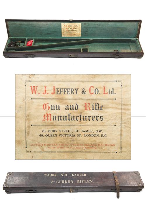 the interior lined with green baize, a W.J. Jeffery & Co. Ltd. trade label, brass lock (key missing), internal measurements approx. 47 5/8in. x 6 1/4in. x 2 1/2in., the lid exterior printed with 'MAJOR. N.H. BARDER. 7th GURKA RIFLES.'
