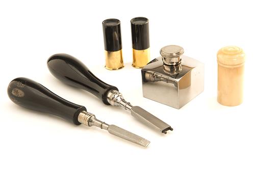 comprising of a pair of brass and nylon 12-bore snap-caps (signed J. Purdey & Sons), a nickel-plated oil bottle (signed J. Purdey & Sons), a bone striker pot, a medium turnscrew, striker key