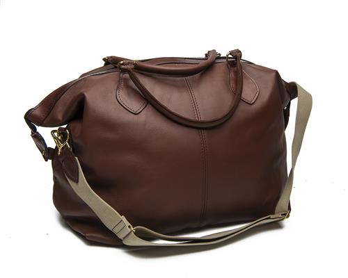 A JO YORATH LEATHER WEEKEND BAG, with canvas and leather shoulder strap and brass fittings