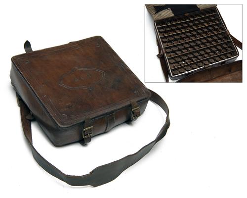 for 100 cartridges, marked 'MADE IN SCOTLAND PATENT NO. 17825. McARTHUR & PRAIN HIGH ST. MONTROSE', leather shoulder strap