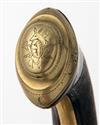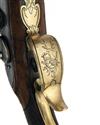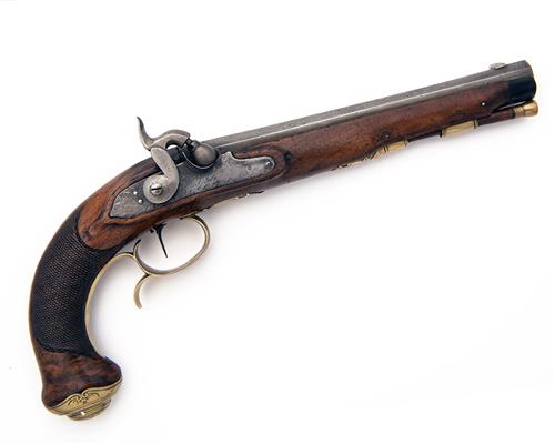 circa 1790 and converted from flintlock, with slightly swamped octagonal 9in. barrel, the top flat inlet in silver 'JOS. LICHLENFELS IN CARLSRUHE', the top side-flats and breech further inlaid with running vines, scrolls and arabesques (all rubbed), dove-tailed fore-sight, adjustable standing notch rear-sight, flat lock with inlaid scroll border and signed 'LICHLENFELS CARLSRUHE', plain hammer, walnut full-stock with strongly curved and chequered butt, swollen pommel fitted with a carved and engraved brass butt-cap, brass trigger-guard with spur and vase finial, carved ramrod channel with brass thimbles and brass-tipped ramrod and engraved brass side-plate
