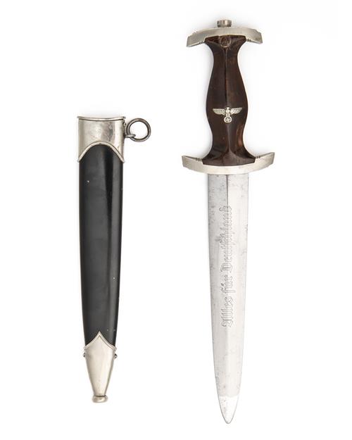 circa 1935, with cleaned double edged 8 3/4in. blade etched with the motto ' ALLES FUR DEUTSCHLAND' (everything for Germany), makers mark to the reverse, brown wooden grip inlaid with an eagle and swastika and the 'SA' roundel to top of hilt (old inlet repair and age cracks, re-varnished), solid nickel fittings with area stamp 'Ho' (Hockland) and its service issue number 'R84/17210', complete with its black painted metal scabbard with number repeated to the nickel throat