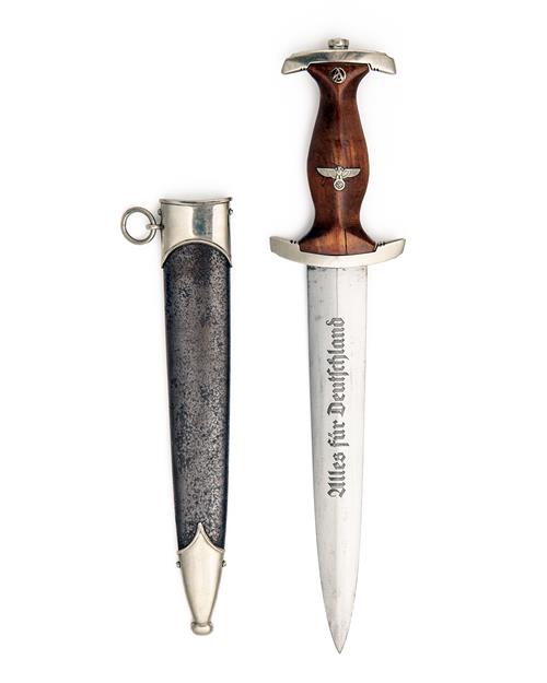 circa 1935, with double edged 8 3/4in. blade etched with the motto ' ALLES FUR DEUTSCHLAND' (everything for Germany), makers mark to the reverse, brown wooden grip inlaid with an eagle and swastika and the 'SA' roundel to top of hilt, solid nickel fittings with area stamp 'He' (Hesson), complete with its original brown anodised metal scabbard with nickel chape and throat (generally good order with speckling to scabbard anodising)