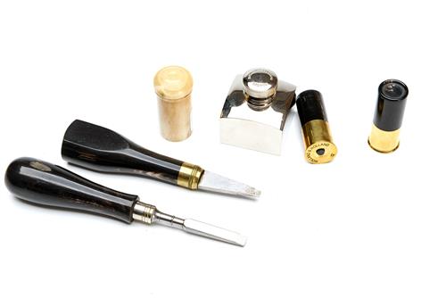 comprising of a pair of 12-bore snap-caps signed Holland & Holland, a nickel-plated oil bottle signed Holland & Holland, a striker pot and two turn screws