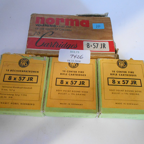 THIRTY FIVE 8 X 57 JR CARTRIDGES BY RWS & NORMA comprised of 10 rounds norma 196 grain sp, 25 rounds rws 196 grain sp
