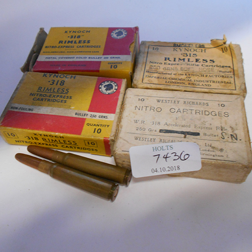 FORTY .318 RIMLESS NITRO EXPRESS CARTRIDGES, comprising of, ten ici kynoch birmingham white lable sealed carton 250 grn soft nose, 10 westley richards white lable sealed box 250 grn soft nose, 10 kynoch with n/g powder 250 grn bullet, 10 kynoch metal covered soft nose 250 grn bullet.