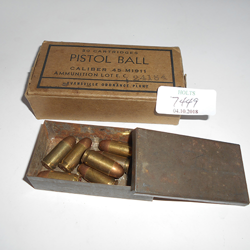 FIFTY SEVEN .45 AUTO 1911 COLLECTABLE CARTRIDGES MOST BY EVANSVILLE ORDNANCE PLANT, comprising of an original carton by evansville ordnance with 50 original 1911 .45 auto cartridges in, plus a .45 auto tin with just 8 imi cartridges in.