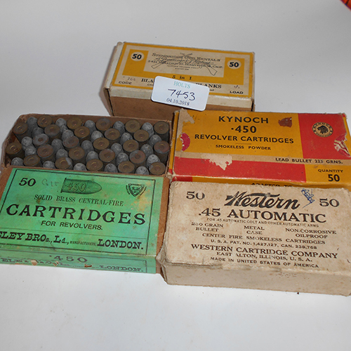 TWO HUNDRED AND FIFTY .45/.450 COLLECTABLE CARTRIDGES, comprising of a sealed eley bros london collectable carton of 50 .450 labled as being "Made "Expressly for Colt's Patent Fire-Arms Manufacturing Co. 14 Pall Mall London W.'" another 50 cartridges the same without a lid to the box, 50 kynoch .450 adapted for webley & scott revolvers 223grn lead bullet corroded, 50 'western' 45 automatic cartridges in original collectable carton and 50 'five in one' blanks in original stembridge gun rentals carton, hollywood california.