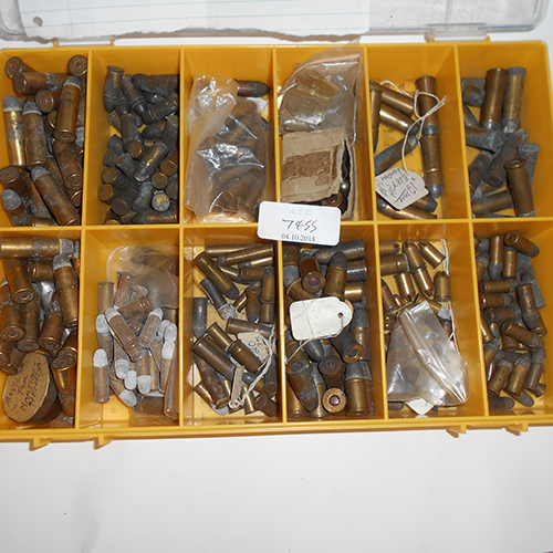 A COLLECTORS LOT OF APPROXIMATELY 220 FLANGED PISTOL CARTRIDGES FROM .32 TO 12 MM, comprising of service pistol rounds of approximately 86 .44wcf, 30 .38 rimfire, 40 .32-40, 12 .450, 8 12mm, 20 sundry others various cals, 20 .45 mk11 1938, 20 various blanks, 20 .38 cal. all enclosed in a dedicated plastic display box.