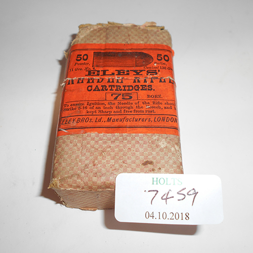 APPROXIMATELY FORTY EIGHT 75 BORE ELEY BROS LONDON NEEDLE FIRE RARE CARTRIDGES FOR RIFLES. comprises of an opened original paper packet of cartridges.