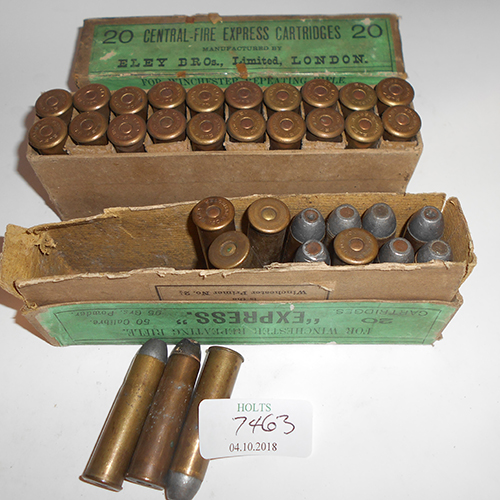 THIRTY FOUR .50-95 CARTRIDGES FOR WINCHESTER REPEATING RIFLE BY ELEY BROS LONDON, comprising of an opened original retail carton of 20 rounds and another carton minus the bottom of fourteen cartridges, highly collectable
