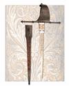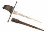 Spanish, circa 1860, with highly polished straight 16in. tapering blade double-edged for the last 6 1/4in., the remainder with carved and moulded back edge and etched on both sides with panels of scroll-work on a gilt ground, broad double ringed carved ricasso etched 'ARTILLERIA FABRICA DE TOLEDO' on the left hand face and with right hand face dished for the thumb and etched with scrolls, both faces on a gilt ground, straight iron cross-guard with turned dome-ended quillions, sail-form knuckle-guard etched with scrolls on the outer face, fine wire-bound grip-piece quartered with plain bars and swollen pommel with engraved edge, complete with its leather scabbard with etched scroll-work to the iron mounts (losses to finish on leather)