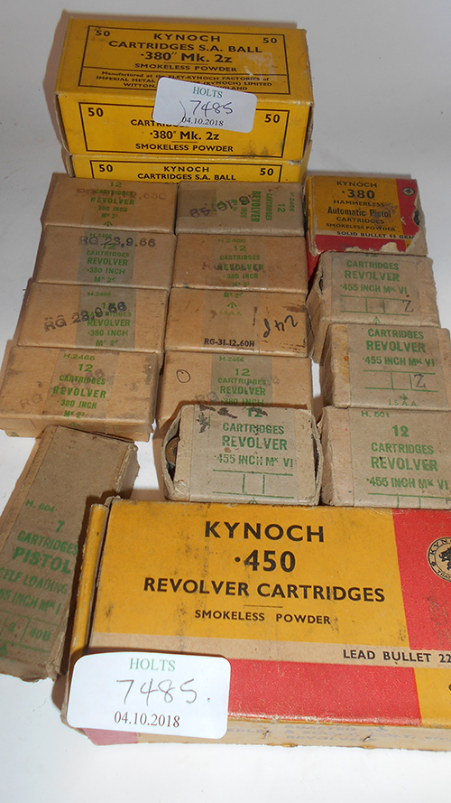 TWO HUNDRED AND SIXTEEN COLLECTABLE PISTOL CARTRIDGES, comprising of two kynoch cartons of 50 .380 mk2x, 72 rg issue .380 revolver in packets of 12, 48 rounds of .455 revolver in issue cartons of 12, one carton of 7 rounds of issue .455 self loading pistol, 46 rounds of .450 revolver in one carton by kynoch.