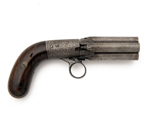 AN 80-BORE PERCUSSION FOUR-SHOT PEPPERBOX REVOLVER, UNSIGNED, MODEL MARIETTES PATENT, no visible serial number,