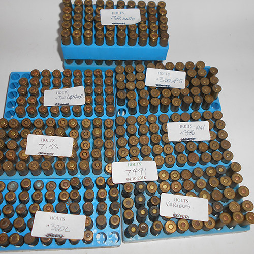 FOUR HUNDRED AND EIGHTY SEVEN COLLECTABLE PISTOL CARTRIDGES, comprising of, one hundred .38 auto, forty four .30 luger, forty seven .360 No5, fifty 7.53mm, fifty .380 (1941), forty eight .320L, fifty various others, most have some corrosion.