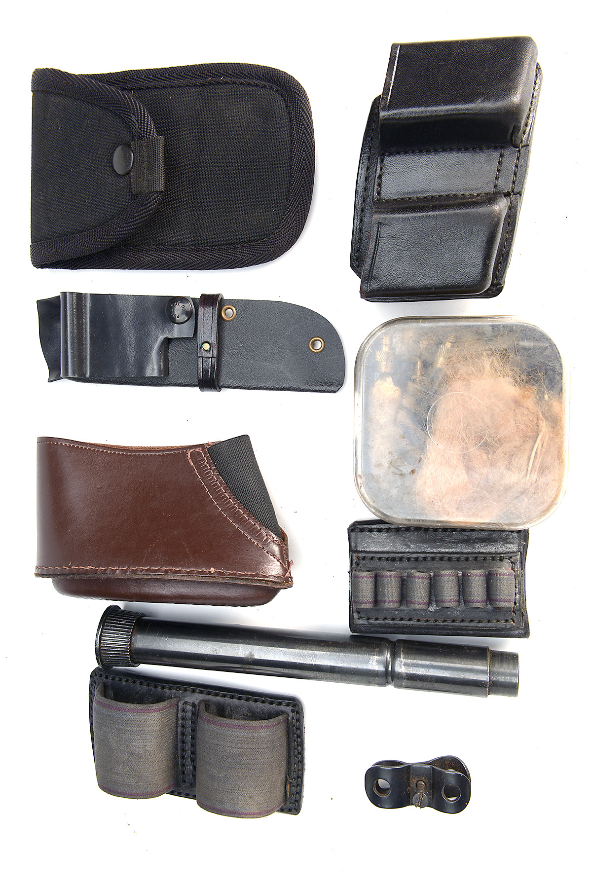 A COLLECTION OF GUN RELATED ITEMS, comprising of a slip on stock extension, leather belt pistol spare magazine holders, canvas belt pouch.
