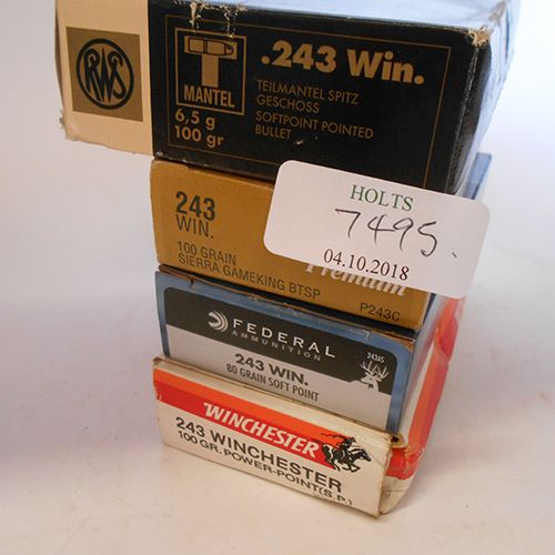 FIFTY SEVEN .243 WIN CARTRIDGES, comprising of seven rws 100 grn sp, 20 federal premium 100 grn sierra gameking boat tail soft point, ten federal 80 grain sp, twenty winchester 100 grn sp .
