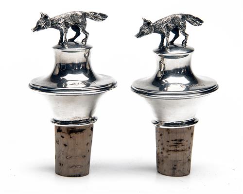 A PAIR OF STERLING SILVER FOX-THEMED CORK BOTTLE STOPPERS,