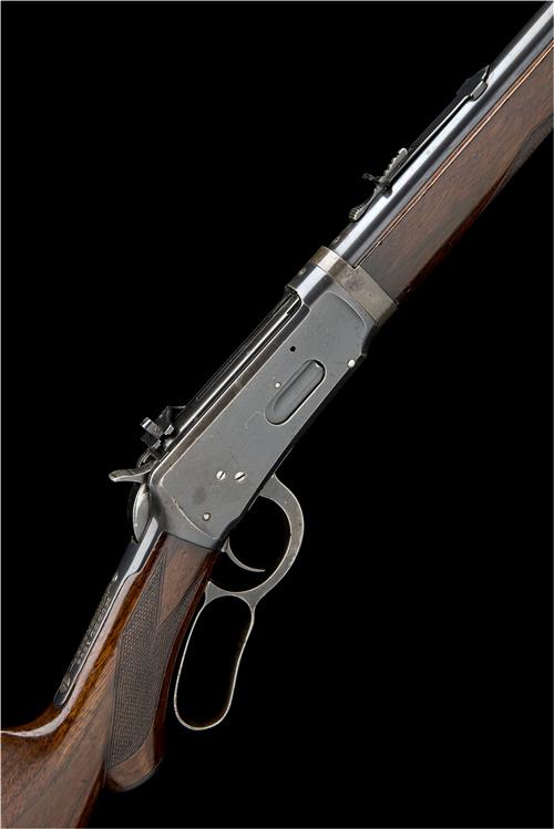 for 1907, with blued round 22in. barrel, dove-tailed 'LYMAN' folding ring fore-sight, buckhorn rear-sight, the left-hand side of barrel signed 'MANUFACTURED BY THE WINCHESTER REPEATING ARMS CO. NEW HAVEN CONN. USA PATENTED AUGUST 21 1894', slab-sided blued action with central hammer and fitted with a contemporary 'LYMAN' receiver sight, top-tang marked 'MODEL 1894, WINCHESTER, TRADE MARK REG. U.S. PAT. OFF. & FOREIGN', chequered walnut pistol-grip butt-stock with hard-rubber grip cap, iron crescent heel-plate, curved under-lever, plain trigger, chequered walnut fore-end with iron cap, full-length magazine with take-down lever at tip, fitted with eyelets for the Winchester sling (absent), strong amount of finish remaining