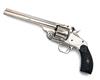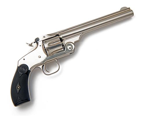 with nickel-plated 7in. barrel, the sighting rib signed and with patent dates to 1871, pinned crescent fore-sight, standing notch to the blued barrel-latch, break-open frame with auto-ejecting fluted cylinder, short ejector housing, single action mechanism, rounded butt with chequered hard-rubber grips, the heel slotted for the detachable shoulder stock and stamped with a broad arrow, the back-strap with corresponding stock location hole, the whole retaining virtually all its later but period plated finish and complete with a boxed factory Smith & Wesson un-stamped shoulder stock with walnut butt and nickel furniture except chequered hard rubber heel-plate, appearing little unused