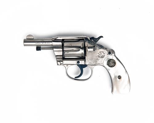 for 1906, with round tapering 2 1/2in. barrel, the left hand side marked 'COLT D.A. 32', the, right 'POCKET POSITIVE', the top signed 'COLTS PT. FA. MFG. CO. HARTFORD CT. U.S.A. PAT AUG 5. 1884 JUNE 5 1900 JULY 4 1905' on three lines, crescent fore-sight, grooved sighting channel to the top-strap, fluted swing-out cylinder, plain frame, the side-plate stamped 'COLTS NEW POCKET' in a circle surrounding the Colt stallion trademark, pull-back cylinder release catch, factory smooth mother of pearl grips embossed with the 'COLT ' logo, the whole retaining much original nickel plated finish (some frosting).