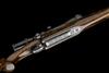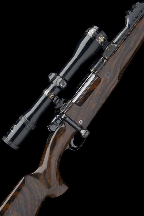 25 3/4in. nitro barrel gold-inlaid with the calibre designation and with fine acanthus scroll engraving with gold line detailing, scroll-engraved block-mounted open sights with two folding leaf sights (unmarked) and ramp-mounted blade fore-sight, the receiver (with thumb cutout) mounted with a Zeiss Diavari-Z 1,5-6x42 T* telescopic sight, serial no. 530034, in quickly-detachable mounts, the rings scroll engraved and with decorative gold-inlaid designs, the receiver engraved en suite, the sidewall with 'DEUTSCHE WAFFEN-UND MUNITIONSFABRIKEN OBERNDORF A/N', the bolt engraved and gold-inlaid, with decorative chequered panels to the knob handle, engraved recoil blocks, hinged straddle floorplate with push button release, fine acanthus scroll engraving with ornate gold inlay on a blacked finish, highly-figured unchequered pistolgrip stock with cheekpiece, birdshead grip with palm swell, sling eyes, 14 1/4in. pull including 7/8in. rubber recoil pad, weight 9lb. 6oz. (unscoped) and 10lb. 15oz. (with scope)