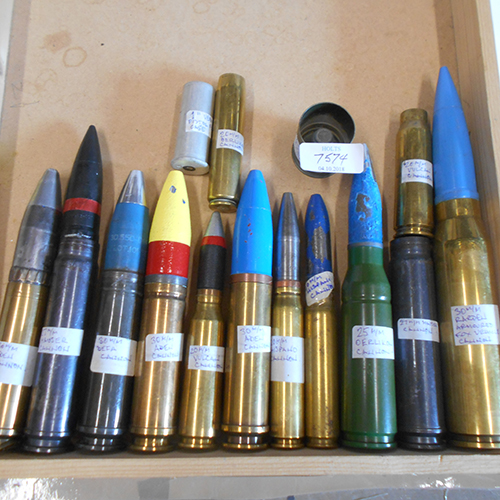 A MIXED LOT OF CANNON AND HEAVY MACHINE GUN INERT SHELLS FOR COLLECTORS, comprising of 3 x 30mm aden cannon , 2 x 27mm mauser cannon, 1 x 30mm defa cannon, 1 x 20mm vulcan cannon, 2 x 20mm hispano, 1 x 25 mm oerlikon, 1 x 30mm radon armoured fox vehicle cannon, 1 one inch very pistol case, 1 x 20mm oerlikon case, 1 x 40mm rifle grenade case.