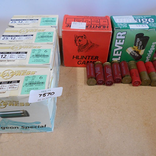 ONE HUNDRED AND TWELVE 12 BORE CARTRIDGES, comprising of three boxes of pigeon special lyalval express, one box with same but six other makes on top, one box 23 mirage 5 s, hot and two odd 6 shot, one box of hunter game 4 shot, 12 loose cartridges that include three 3 in magnum 12 bore cartridges.