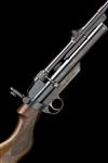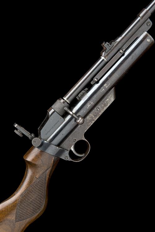 circa 1938, with blued 25 1/2in. detachable barrel, ramp and blade fore-sight, standing notch rear-sight (elevating wheel absent), bolt handled barrel locking catch, blued air-chamber with model details and five lines of patents, maker's details to the trigger unit, no provision for safety-catch, folding peep-sight at wrist, semi saw-handled walnut butt with chequered grip, horn heel-plate and a strong amount of original finish