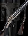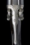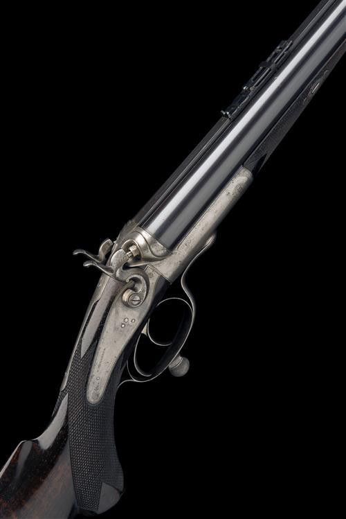 28in. black powder only barrels with broad raised matted rib, the breech end with a banner engraved 'W.W. GREENER. ST. MARY'S WORKS. BIRMINGHAM.', open sights and two folding leaf sights with white metal inlaid sight lines and with folding tangent sight, bead fore-sight, Jones patent rotary underlever, carved percussion fences, rebounding back-action locks with carved hammers, border engraving, retaining very slight traces of original colour-hardening, 14 1/4in. well-figured pistolgrip stock with horn pistolgrip-cap and steel buttplate, weight 10lb. 13oz.