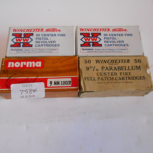 ONE HUNDRED AND EIGHTY FIVE 9mm PISTOL CARTRIDGES, comprising of two cartons of 50 winchester 'luger', one carton of 50 norma 'luger' and 35 winchester parabellum 'full patch' dated 1941 and highly collectable in their original winchester carton.