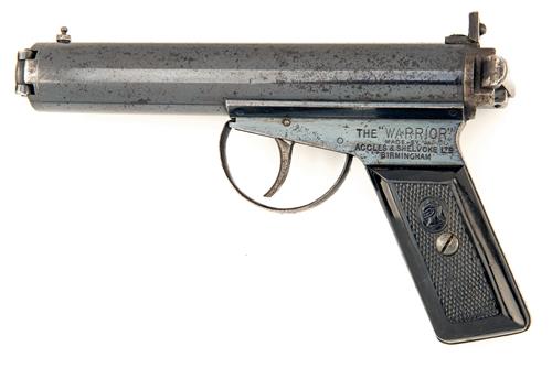circa 1934, with 7 1/2in. rifled concentric barrel concealed within the sighted blued steel air chamber, the frame stamped 'THE WARRIOR, MADE BY ACCLES & SHELVOKE LTD BIRMINGHAM', and on the right-hand side 'F.CLARKE'S PATENT NOS BRIT. 351268, USA 538057', pressed steel trigger guard and chequered horn grips impressed with a 'knight's head' trademark, the whole retaining a strong amount of original finish.